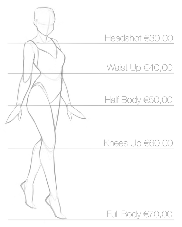General TermsTo order a commission you can send me a private message on Instagram/Twitter or send me an email to [email protected].When you contact me to order a commission it's essential that you know: the type of commission you want (headshot, half body etc.), the purpose of the commission (personal or commercial) and that you give me a description of what you would like (such as the description of the character, the pose, the number of figures etc.).To make me better understand your ideas you can send me any reference image you want (for the pose, for the colors, for a specific type of clothing etc). Don't worry if you think your references are too many, they're never enough and they will be super useful to be able to give life and shape to your initial idea. You can send me all the reference images you want via e-mail, IG dms or Pinterest.Things I won’t draw: